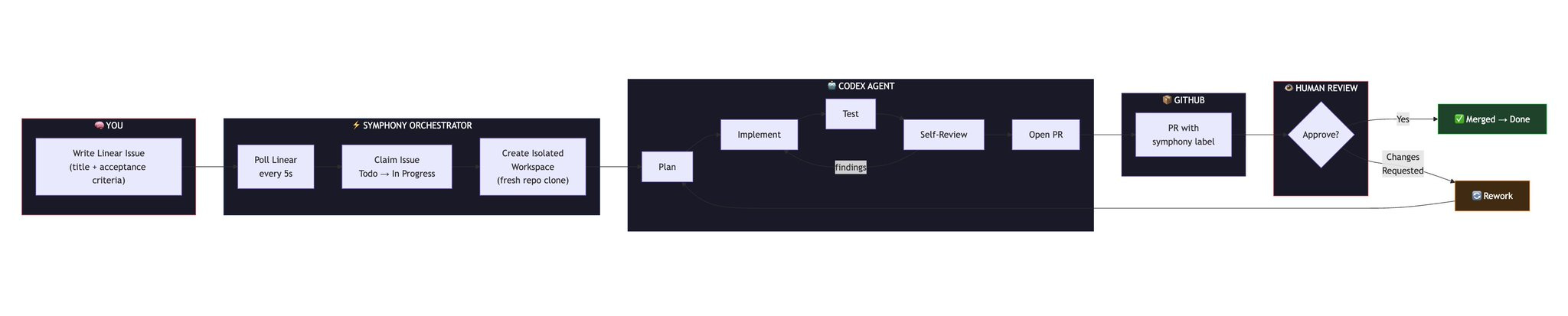 Here’s the loop: you write a ticket in Linear describing what you want built. Symphony polls Linear, picks up that ticket, clones your repository into a fresh isolated workspace, and launches a Codex agent in app-server mode to implement it. The agent plans, codes, tests, opens a pull request, runs a self-review, addresses its own feedback, and only then moves the issue to “Human Review” for you to look at.